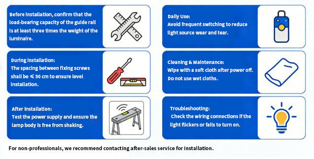 Ensure the conductive copper sheets of the lamp are in tight contact with the copper strips inside the track to avoid flickering or failure due to poor contact.